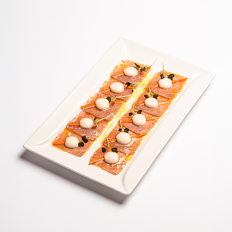 Carpaccio de ventresca de atun rojo (balfego), cremoso de hinojo y gel de limón 23,00€