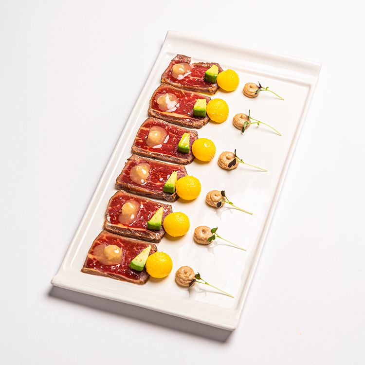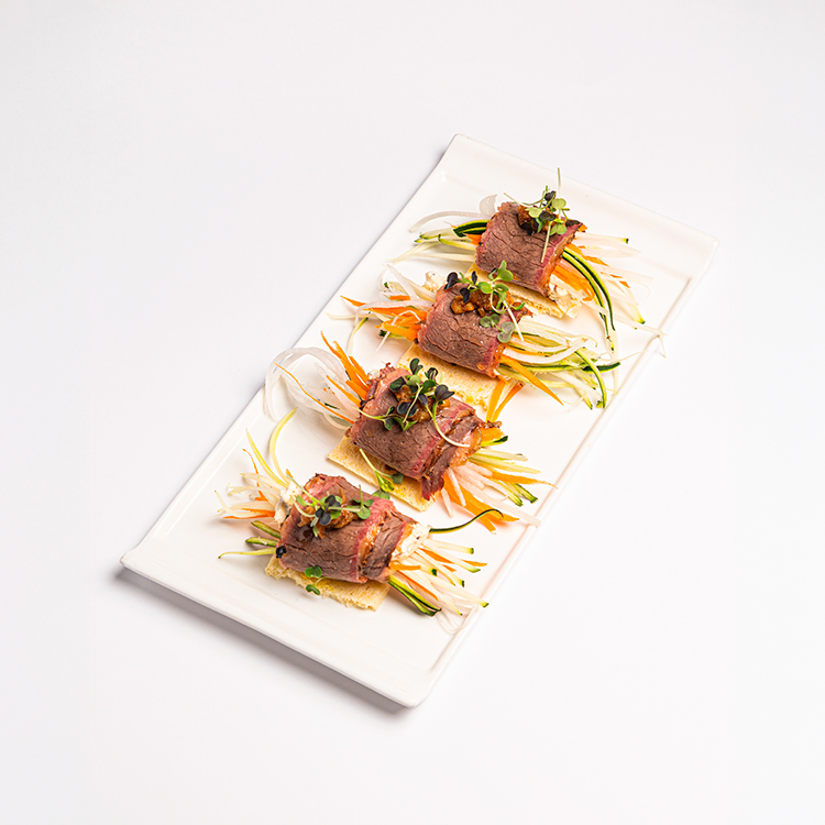 Pastrami hecho en casa con salsa tártara de miso, crudités de verdura, vinagreta de chalotas y avellanas, (4 uds) 18 € / unidad 5,00€