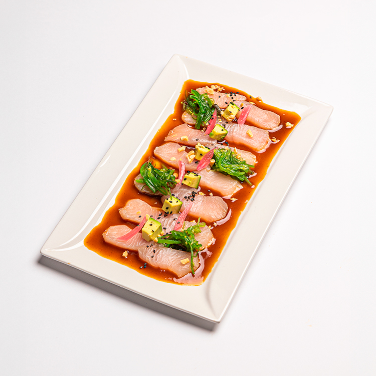 Tiradito de pez mahi mahi estilo nikkei con salsa de ostras, tamarindo, soja, lima, cacahuetes, aguacate y sesamo negro 15,00€