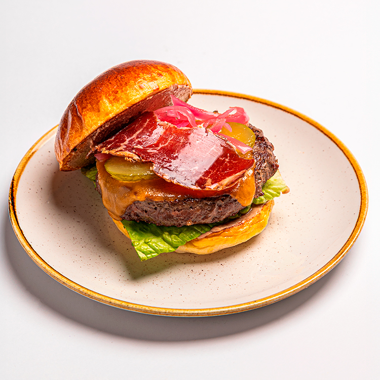 Hamburguesa de vaca gallega, mayonesa de hoisin y cacahuetes, queso cheddar,
