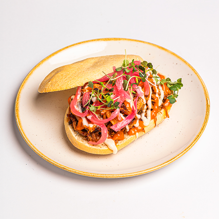 Mollete relleno de pulled pork con salsa barbacoa, cebolla roja encurtida 12,50€